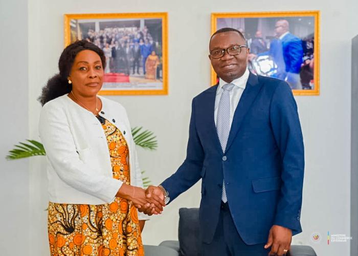 Le Ministre du Commerce Extérieur, Julien Paluku Kahongya et la Ministre Provinciale de la Tshopo en charge du Commerce, Budget, Plan, Petites et Moyennes Entreprises (PEM) et Porte-parole du gouvernement, Claudine Atisandi Elondia, ont eu un tête à tête ce lundi 27 avril à Kinshasa.